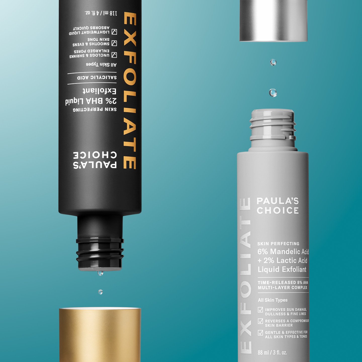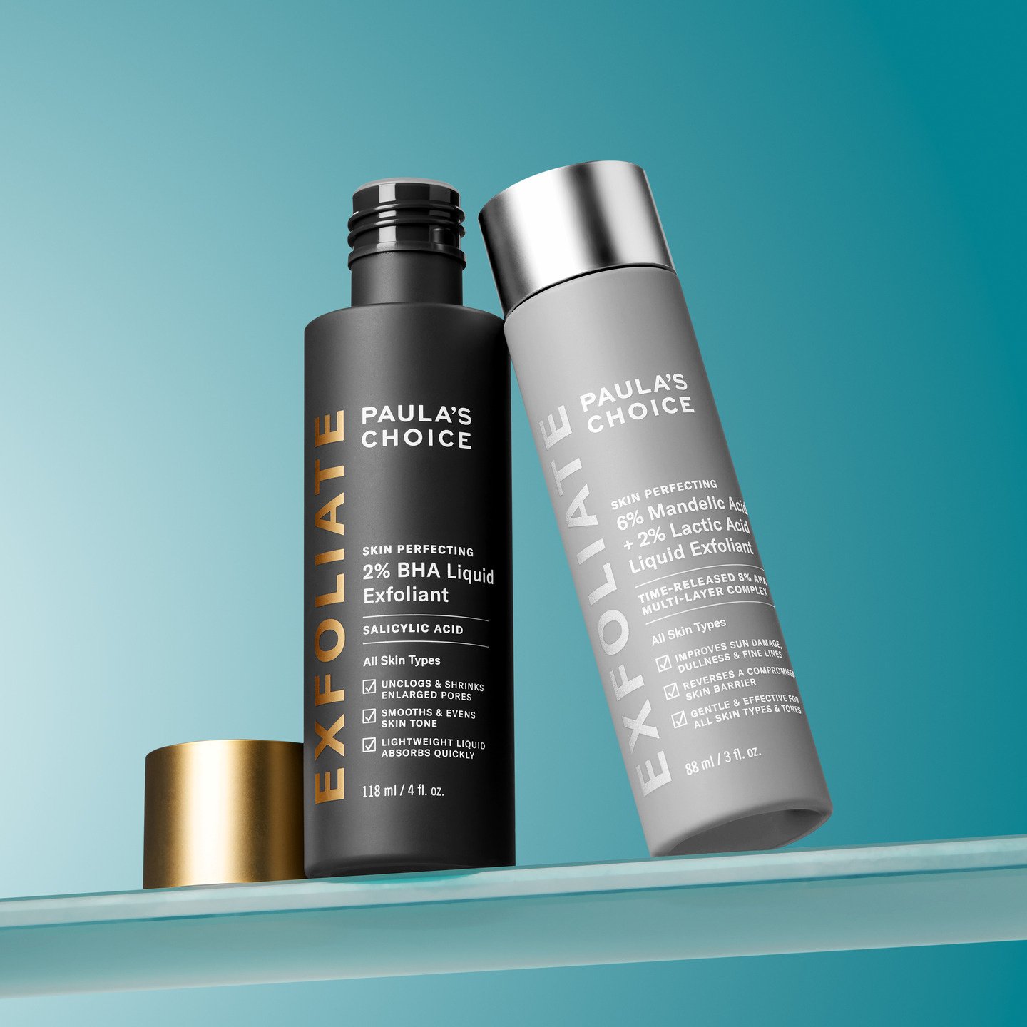 - Full-size exclusieve gouden 2% BHA Liquid Exfoliant OF full-size exclusieve zilveren 6% Mandelic + 2% Lactic Acid AHA Liquid Exfoliant bij besteding vanaf €95