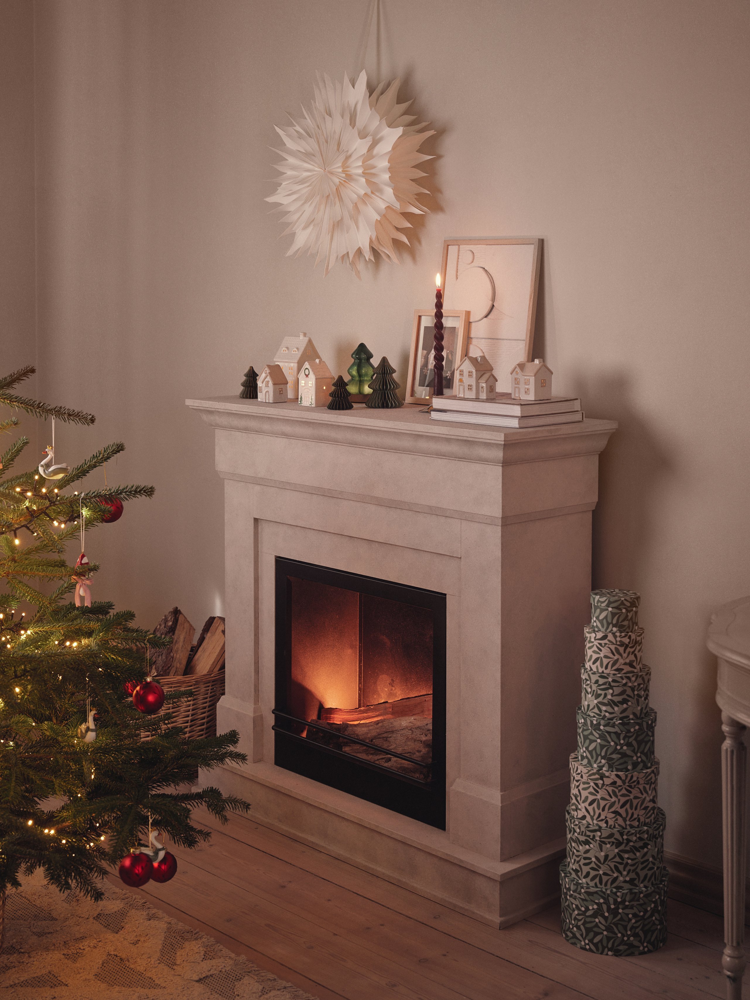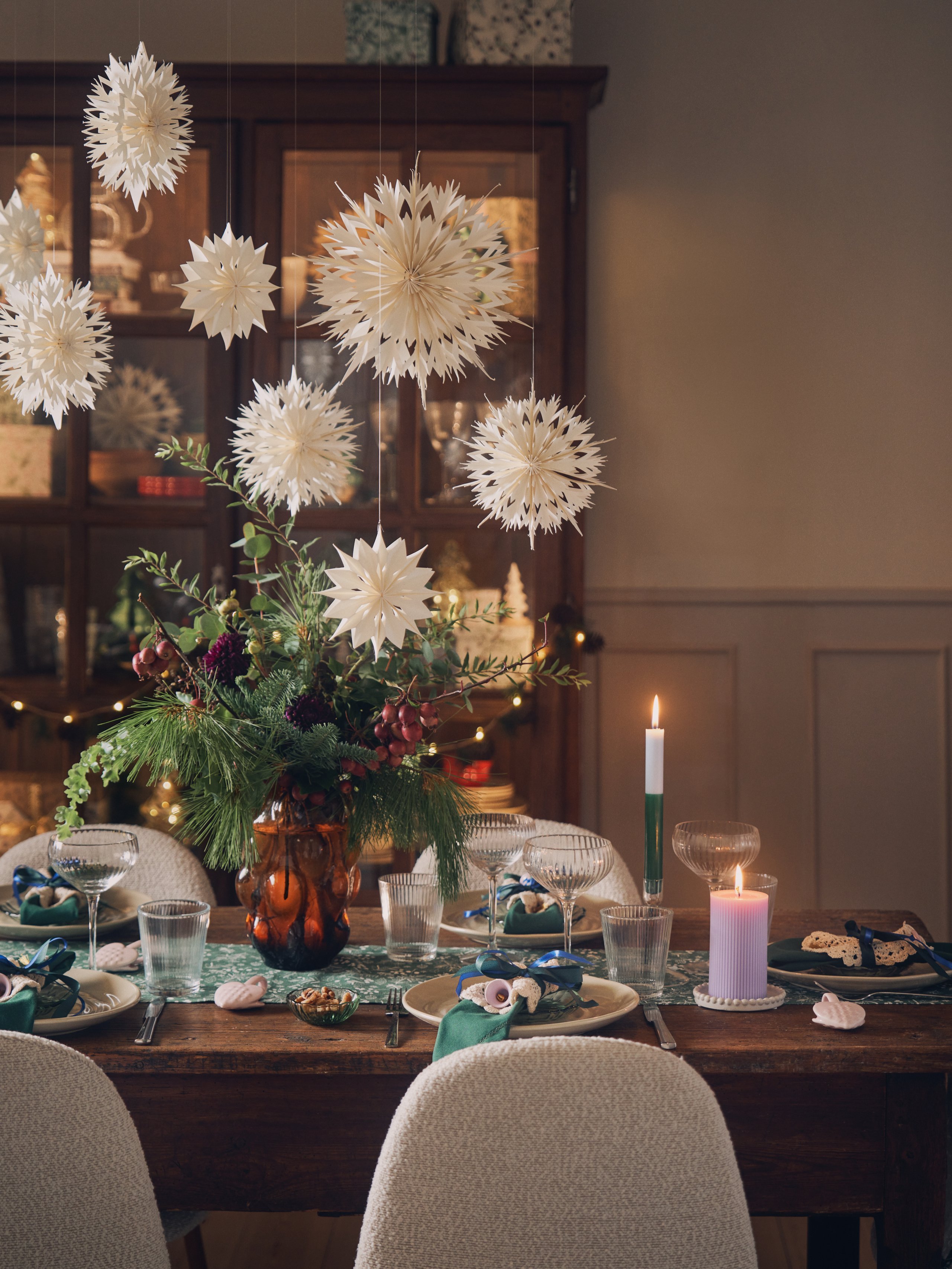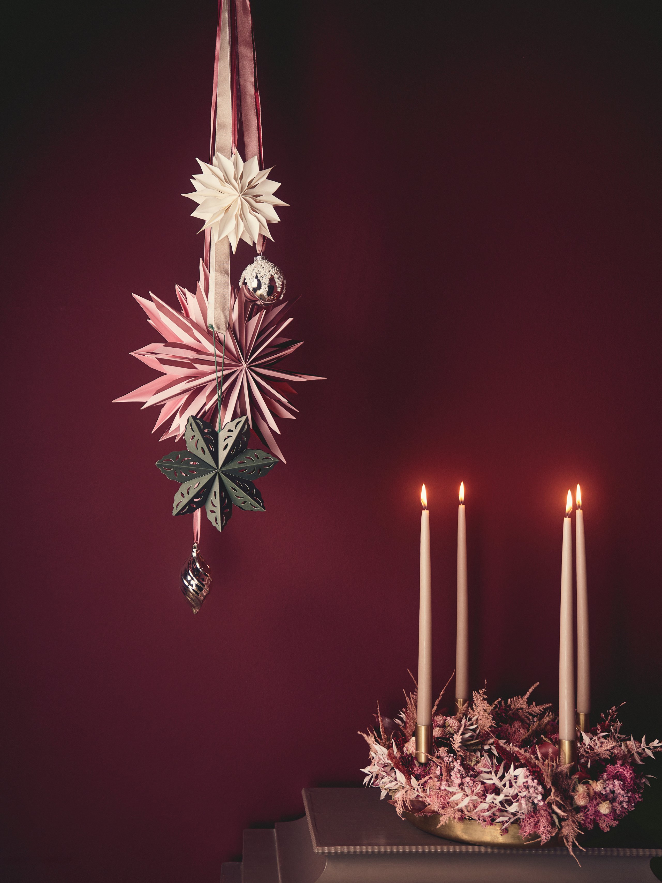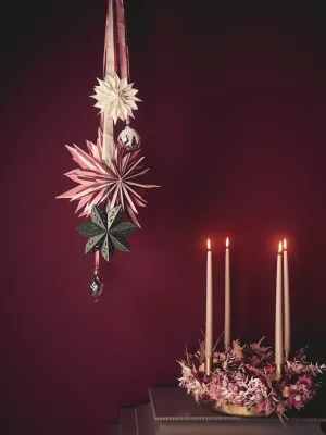 Dit jaar staan twee trendkleuren centraal in kerstdecoraties: roze en diep bordeauxrood, die prachtig samengaan op de populaire vouwbare papieren sterren. Felblauw schittert op zowel kleurrijke papieren kerstballen als glazen kerstballen in de vorm van dennenappels. De geliefde lichthuisjes van vorig jaar zijn terug in nieuwe designs en kleuren, waaronder een roze lichthuisje, geïnspireerd op Nederland.