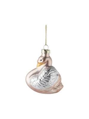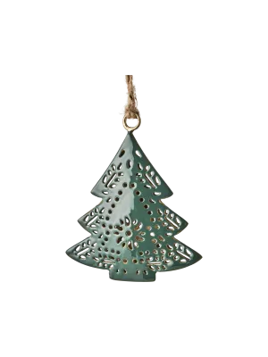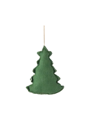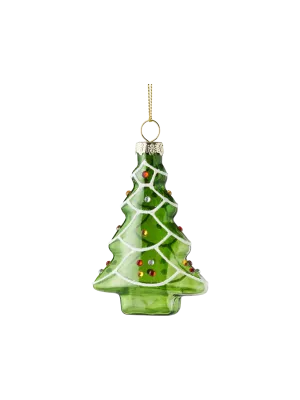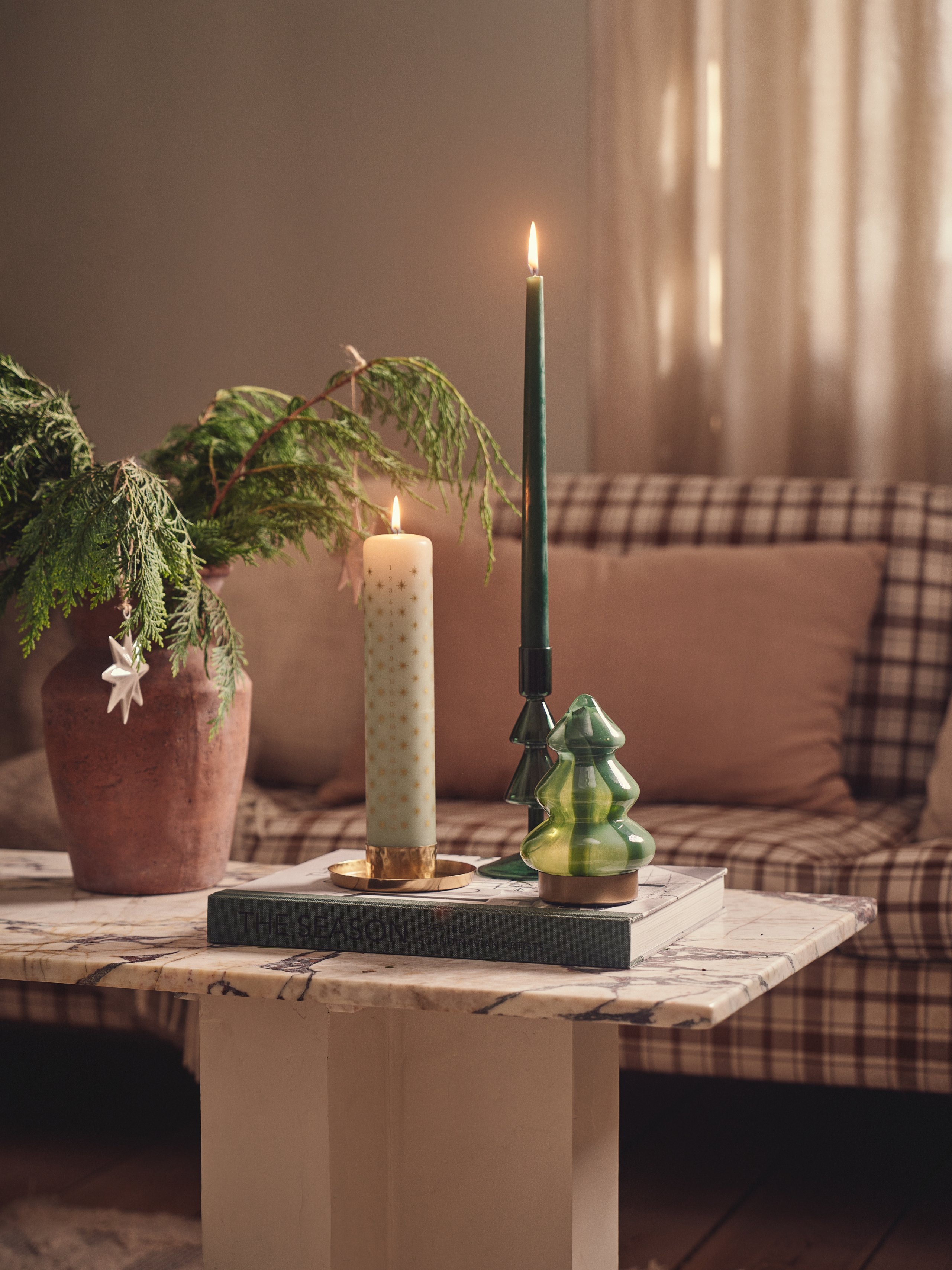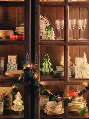 de ornamenten in de dennentakken dienen ook als decoratie voor de kersttafel.