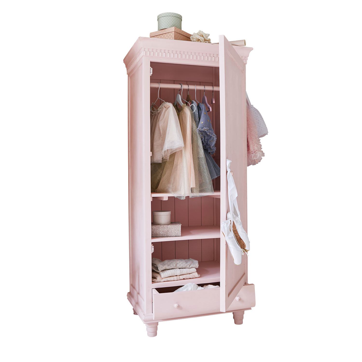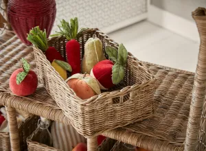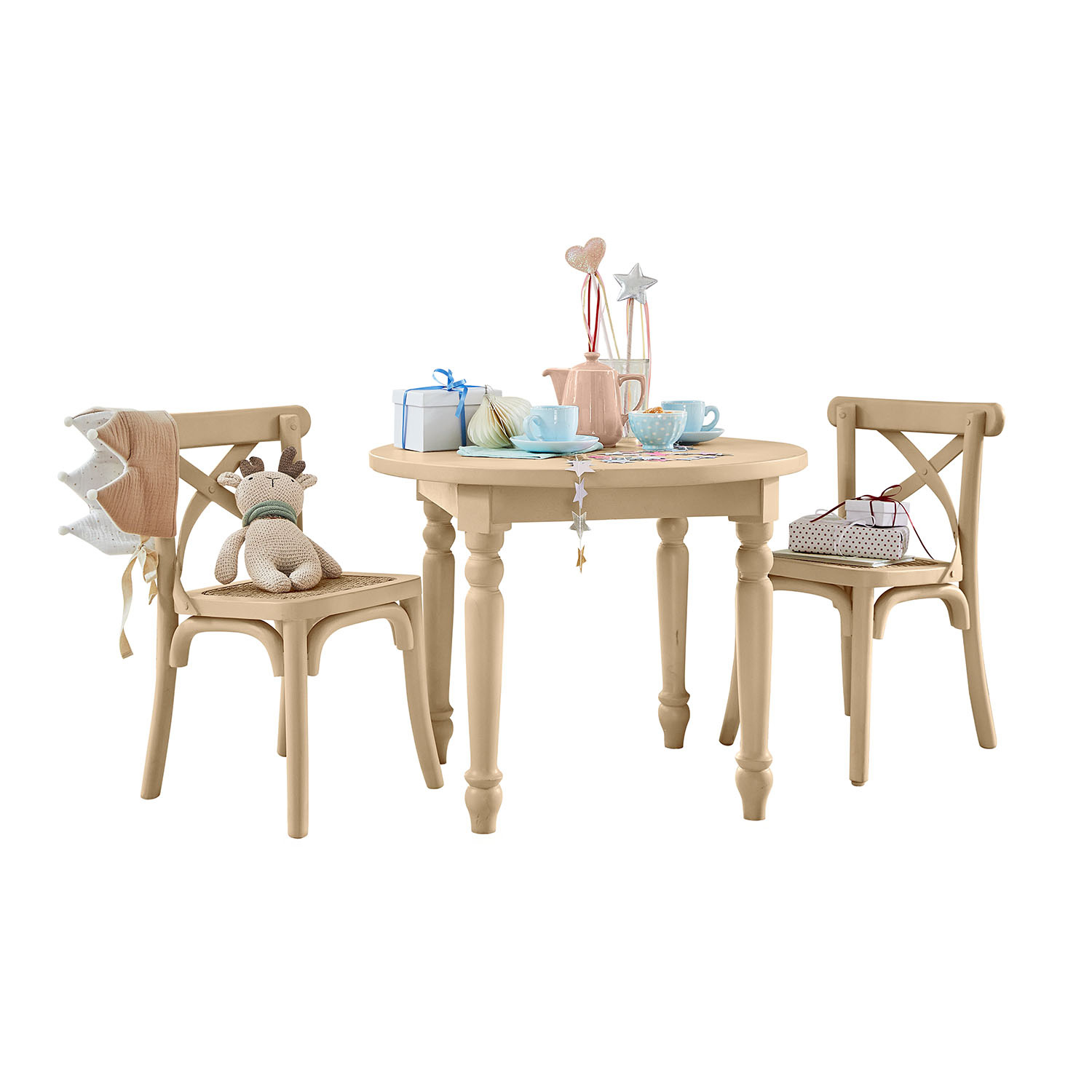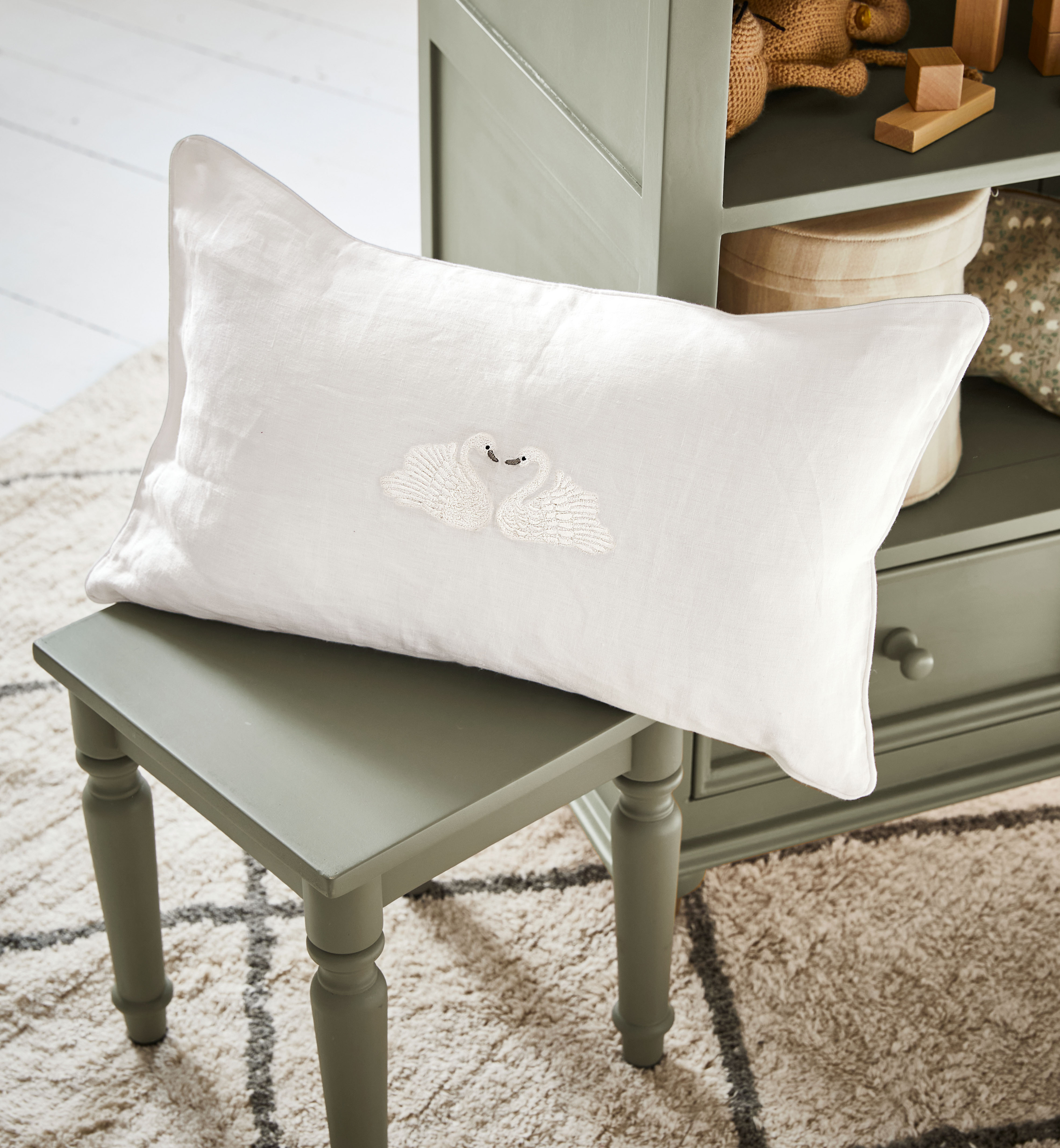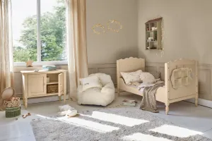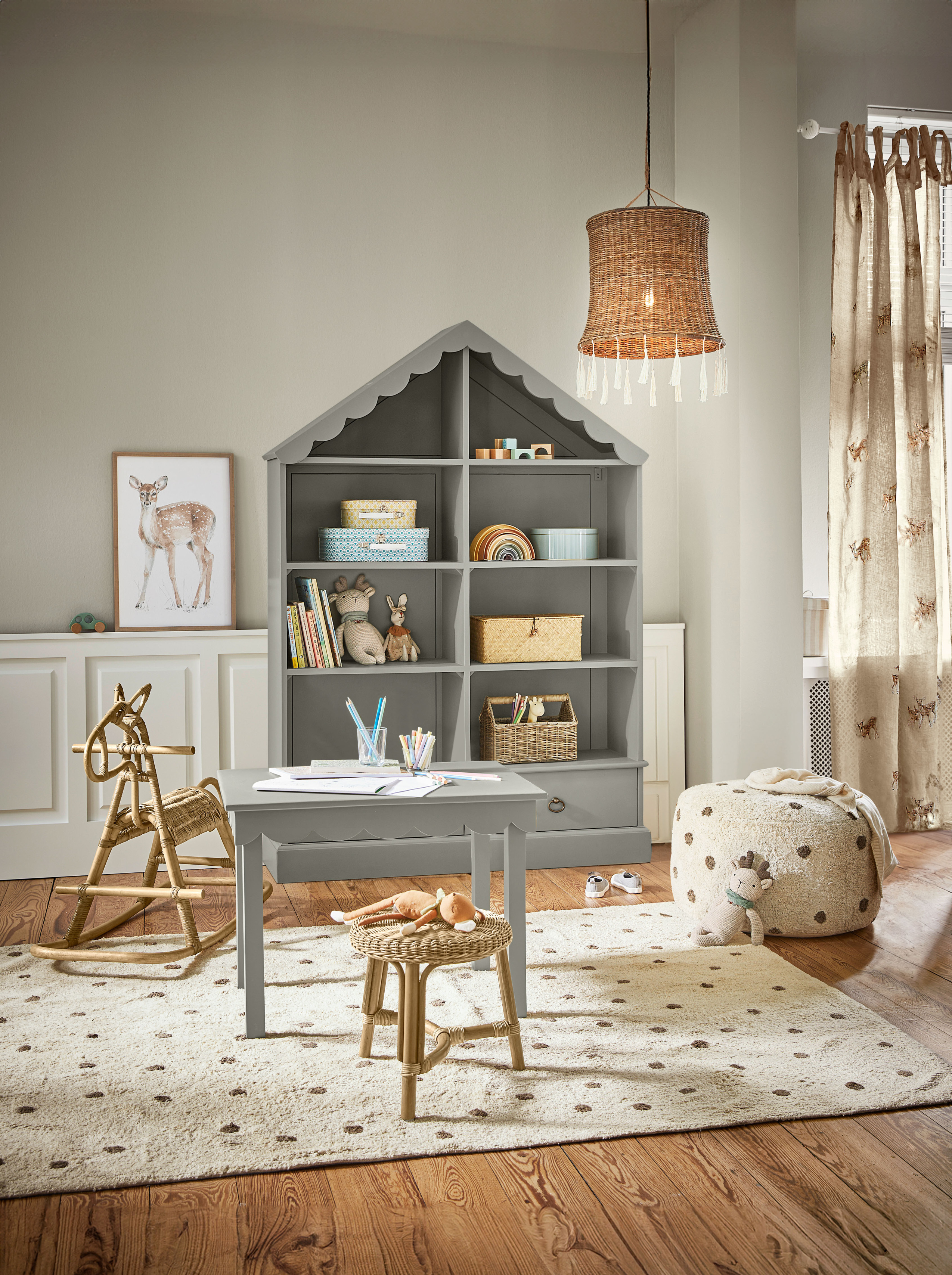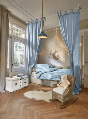 Warme rotanstructuren, lichte houttinten en zachte stoffen zoals linnen en bouclé creëren een harmonieuze basis, terwijl verfijnde details en speelse vormen voor een vleugje magie zorgen. Van een feestelijk versierde kinderkamer vol fonkelende lichtjes tot een droomwereld met stippen, sterren en zwanen, elk stuk ademt de liefde voor ambacht en kinderlijke fantasie.