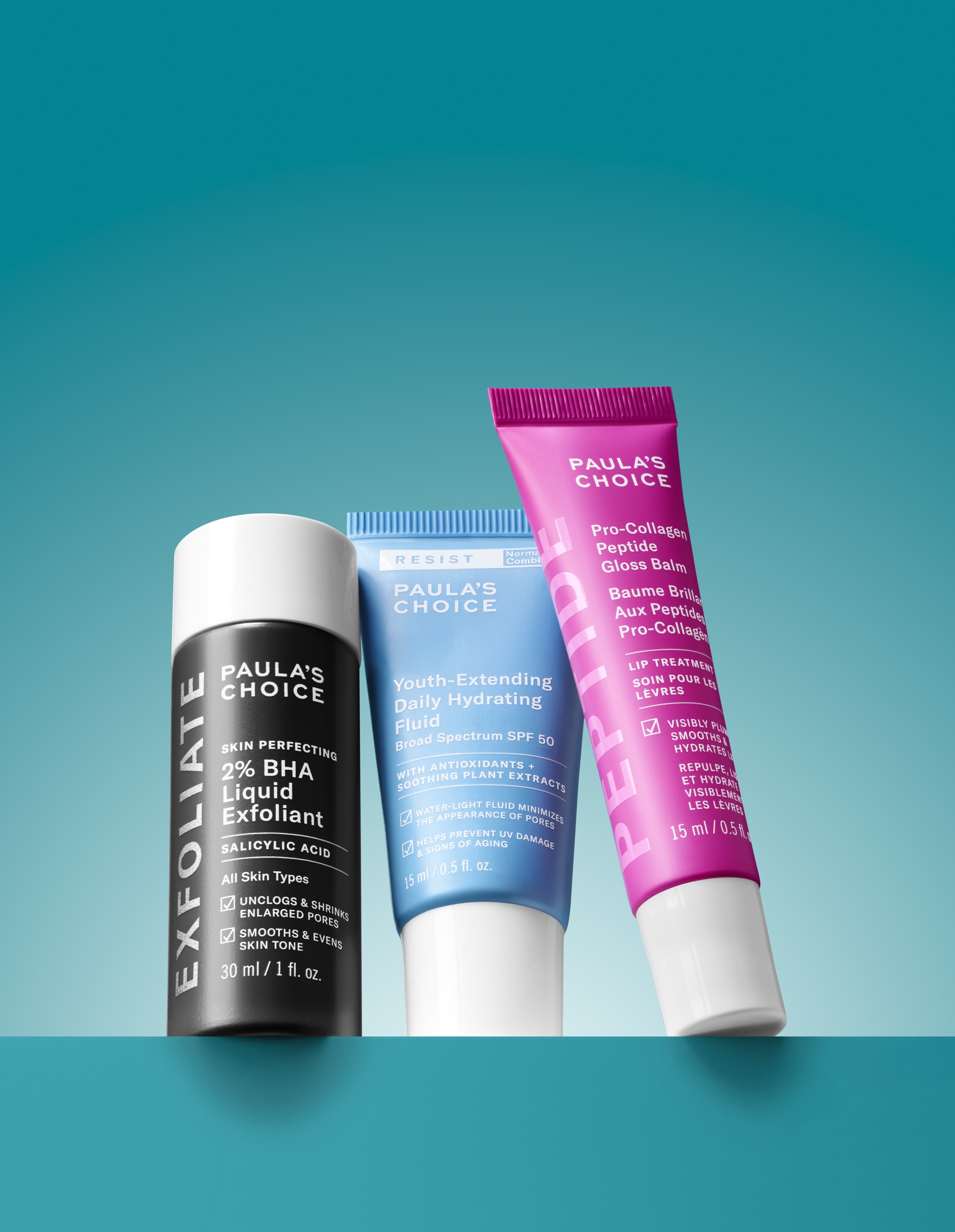 mini 2% BHA Liquid Exfoliant + mini Youth-Extending Daily Hydrating Fluid SPF 50 + full-size Pro-Collagen Peptide Gloss Balm